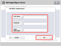 [User Name]: Press [User Name] → enter the user name to use for authentication → press [OK].