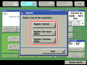 You can register new destinations in the Address Book, one-touch buttons, and favorites buttons from the Send Basic Features and the Address Book screen.