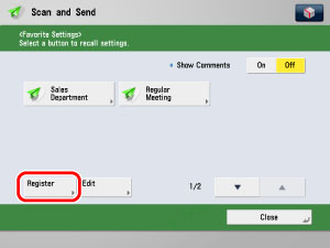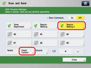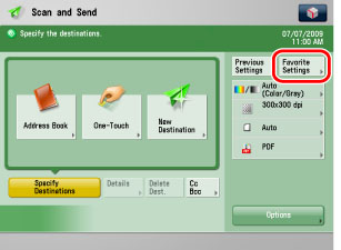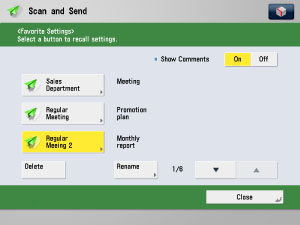 You can set any possible combination of send settings and register them in a favorite settings button in memory. There are 18 favorite settings buttons and they can be assigned names and comments for increased convenience. This feature is useful for registering frequently used send settings.