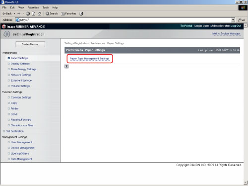 Click [Settings/Registration] → [Paper Settings] from the menu that appears under Preferences → [Paper Type Management Settings].