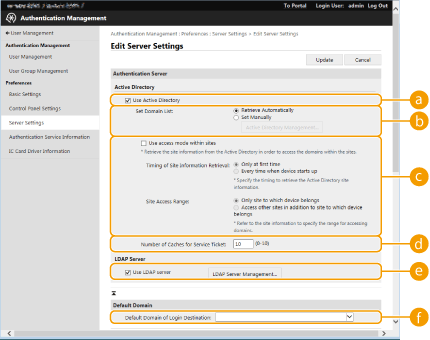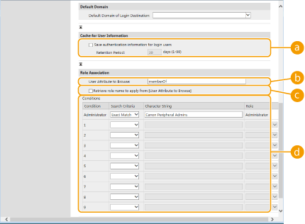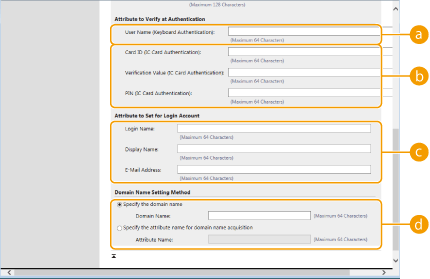 [Specify the domain name] / [Specify the attribute name for domain name acquisition]Select how to set the domain name of the login destination. To specify the domain name directly, select [Specify the domain name] and enter the domain name*. To specify an LDAP data field (attribute name) from which to acquire the domain name on the LDAP server, select [Specify the attribute name for domain name acquisition] and enter the attribute name (Example: dc)*.
