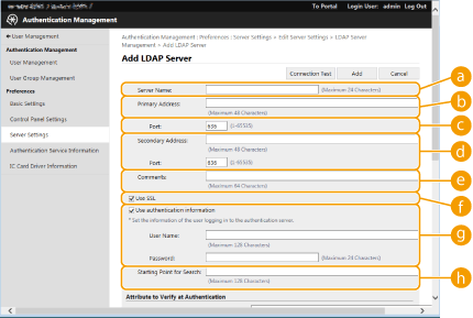 [Port]Enter the port number used for communicating with the LDAP server. Use the same setting that is configured on the server. If you do not enter a number, it is automatically set to "636" when the check box is selected for [Use SSL], or it is set to "389" when the check box is cleared.